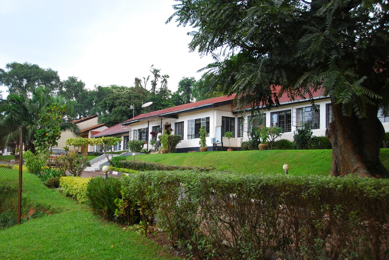 El hotel donde me estoy albergando es una antigua casa de huéspedes dentro de la Universidad de Makerere: por $45 consigues una habitación pequeña con un gran armario empotrado, muebles de la casa de playa de 1988, una tele antigua, un ventilador de pie, y una cama dura (demasiado dura, como me di cuenta a las malas); y por supuesto, las ubicuas bombillas fluerescentes blancas que tan poco acogedores hacen los hoteles en África. La comida suele ser algún tipo de carne (pollo, pescado, cabra, cerdo) a la parrilla o guisada, con algún tipo de guarnición que empape bien (arroz, patatas fritas, matoke); de postre, plato de fruta cortada; para beber, Coca Cola en botella de cristal reutilizable o botella de agua mineral de dos litros, que además de para beber sirve para tomar las pastillas de Malarone y cepillarse los dientes.